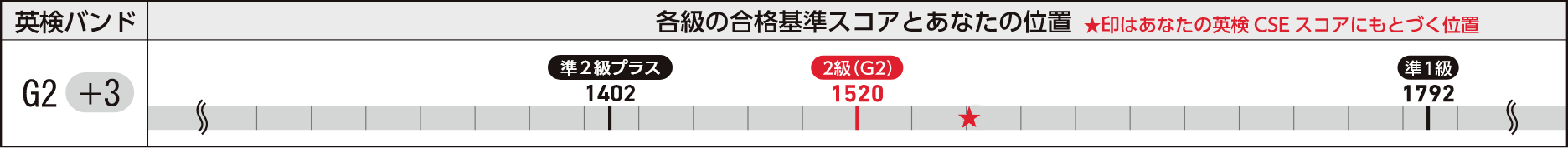 英検2級の一次試験を受験し、一次試験の合計スコアが1575の場合。★の位置はご自身の英検CSEスコアにもとづいて表示されます。この場合、英検2級一次試験合格から+3のバンドに位置していることが視覚的に理解でき、比較的余裕を持って英検2級一次試験に合格したことが分かります。