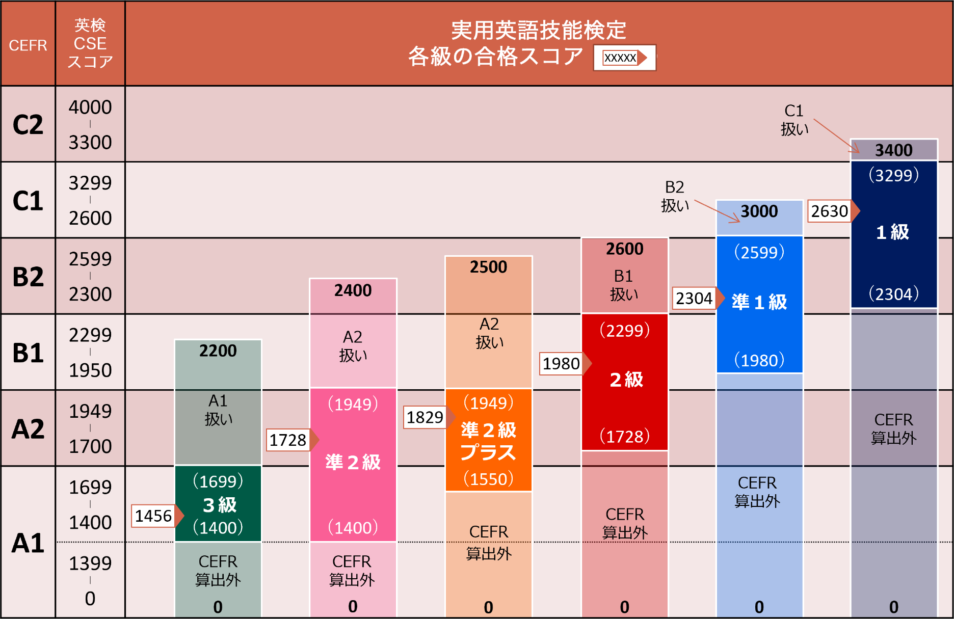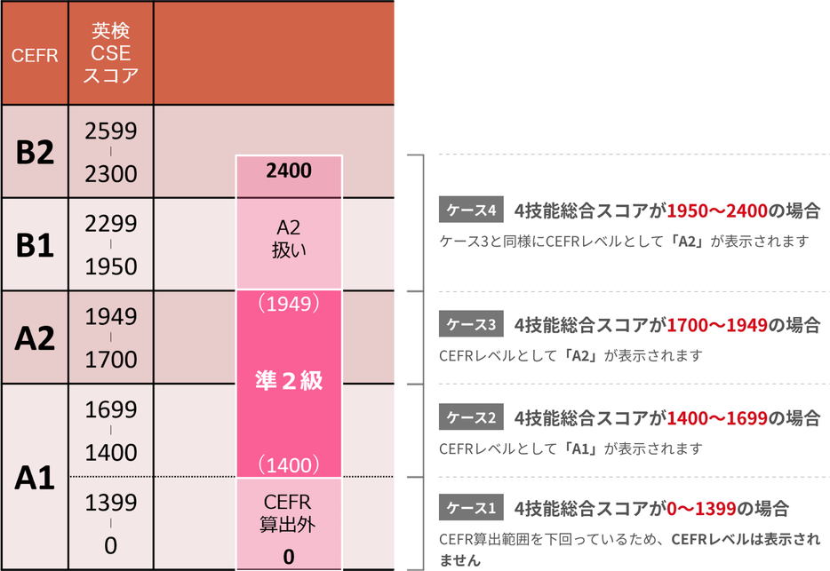 受験級によってCEFRレベルを算出するための英検CSEスコアの範囲(CEFR算出範囲)を定めています。この範囲を下回った場合は、CEFRレベルが表示されません。範囲内の場合は、そのスコアに応じたCEFRレベルが表示されます。この範囲を上回った場合は、その級で算出できるCEFRレベルの上限が表示されます。なお、4級・5級はCEFR算出範囲外であるため、CEFRレベルが表示されません。