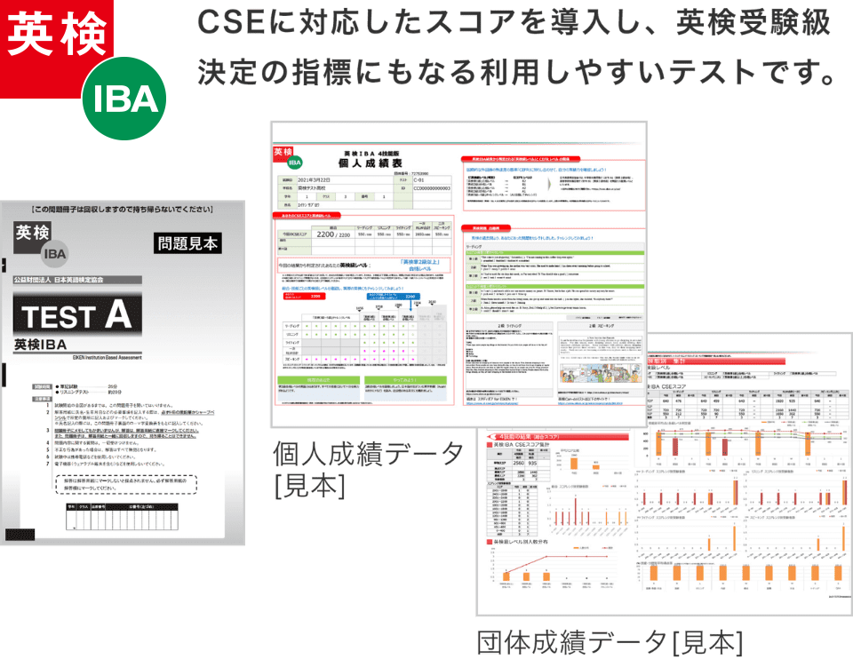 CSEは、英語能力を判定するテスト「英検 IBA」、「英検 Jr.」、「TEAP」などにも活用しています。