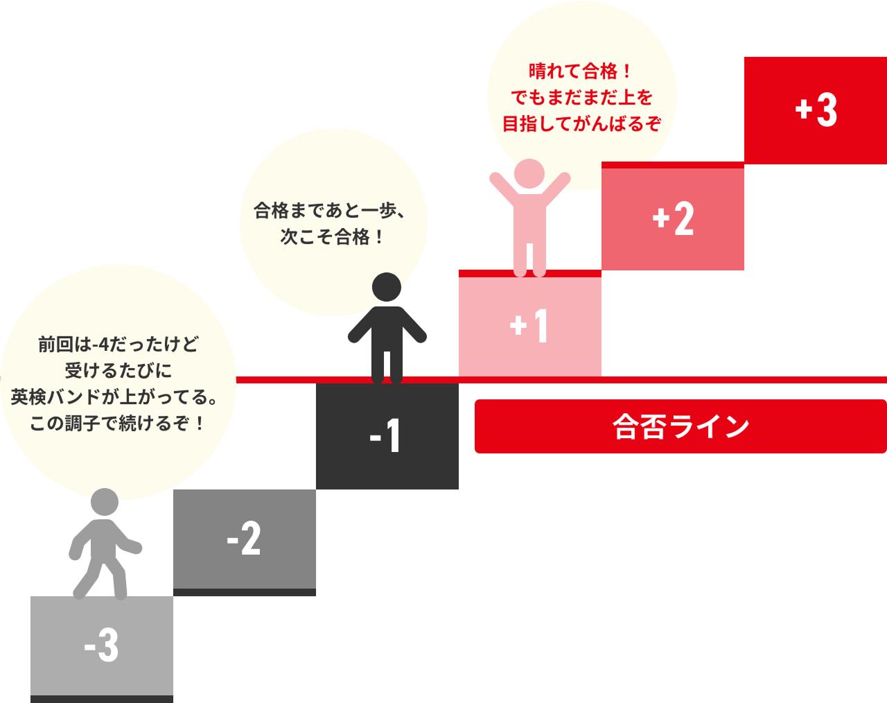 英検バンドは一次試験・二次試験両方の成績表に表示されます。各級の一次試験・二次試験の合格基準スコア(英検CSEスコア)を起点とし、スコアを25点刻みに区切ったものです。合格基準スコア(英検CSEスコア)を上回る一つ目のバンドは+1、その上のバンドは+2です。下回った場合は数字の前に "-" が付きます。